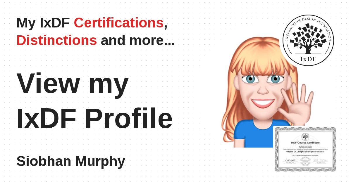 IxDF Course Certificates are awarded to Siobhan Murphy in formal recognition of their coursework surpassing the rigorous benchmarks of exceptional performance established by the IxDF Educational Codex.