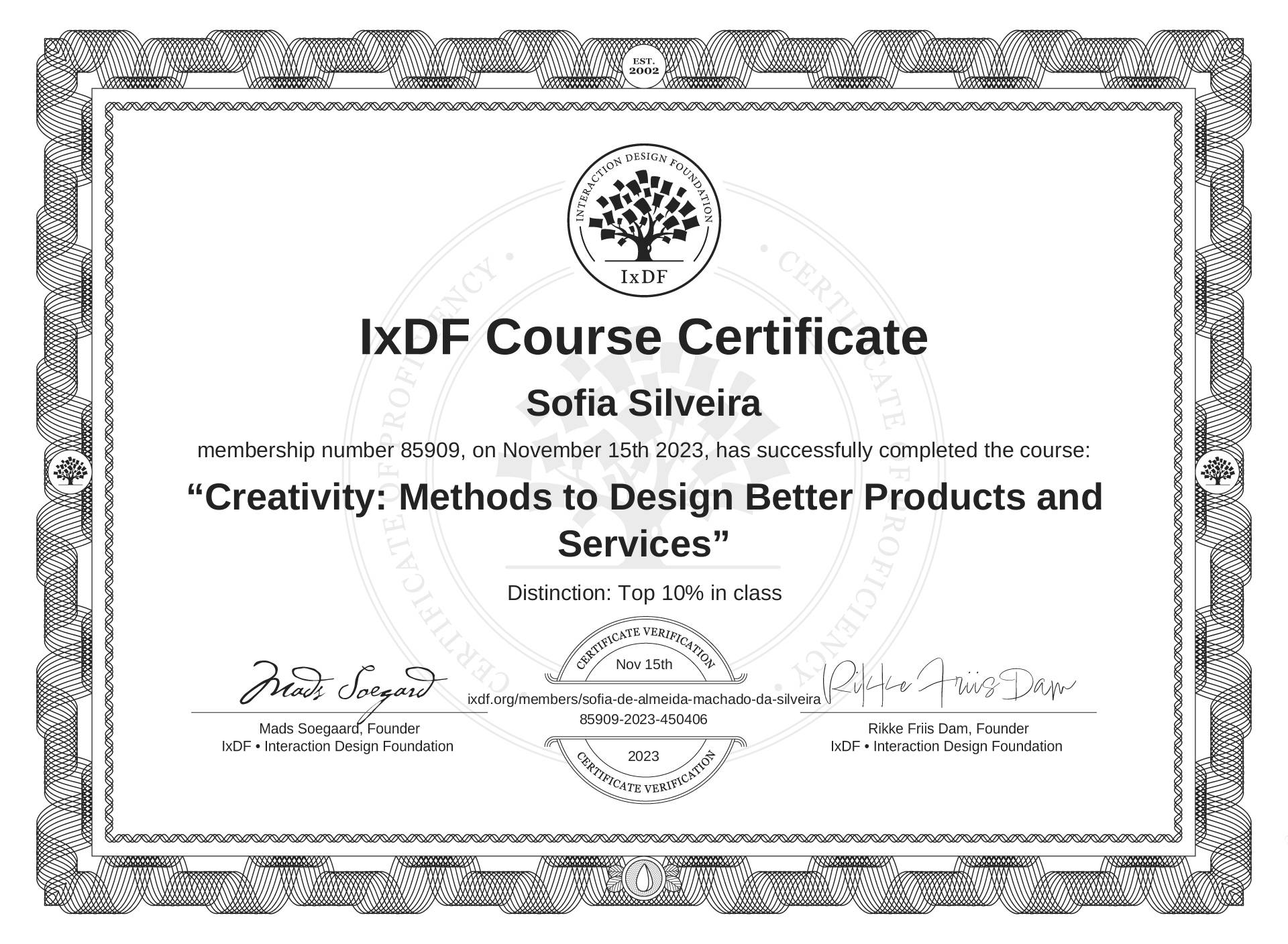 Sofia Silveira's Course Certificate: Creativity: Methods to Design Better Products and Services