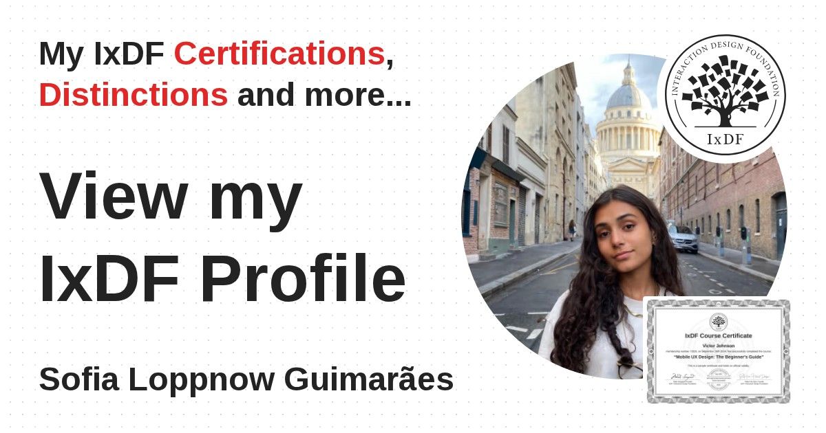 IxDF Course Certificates are awarded to Sofia Loppnow Guimarães in formal recognition of their coursework surpassing the rigorous benchmarks of exceptional performance established by the IxDF Educational Codex.