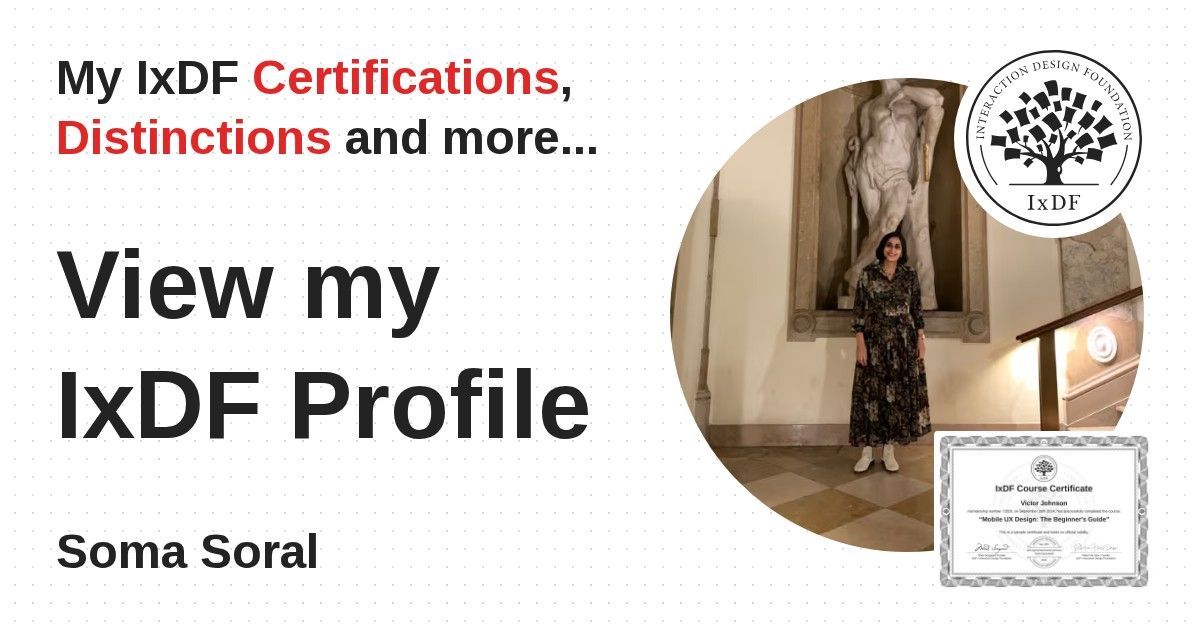 IxDF Course Certificates are awarded to Soma Soral in formal recognition of their coursework surpassing the rigorous benchmarks of exceptional performance established by the IxDF Educational Codex.