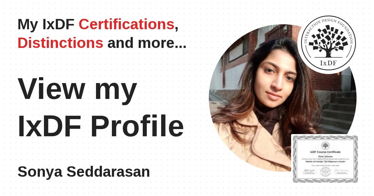 IxDF Course Certificates are awarded to Sonya Seddarasan in formal recognition of their coursework surpassing the rigorous benchmarks of exceptional performance established by the IxDF Educational Codex.