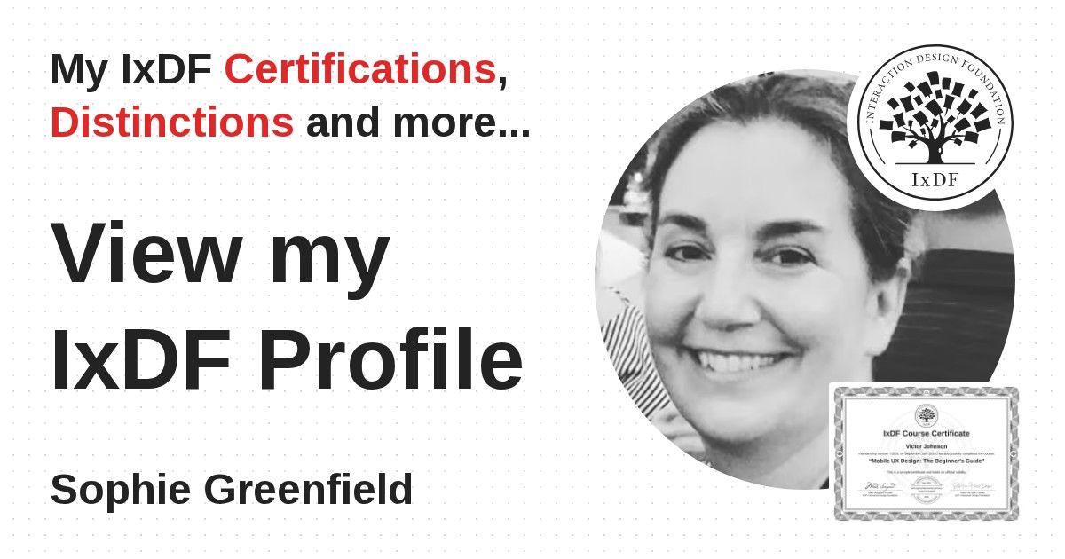 IxDF Course Certificates are awarded to Sophie Greenfield in formal recognition of their coursework surpassing the rigorous benchmarks of exceptional performance established by the IxDF Educational Codex.