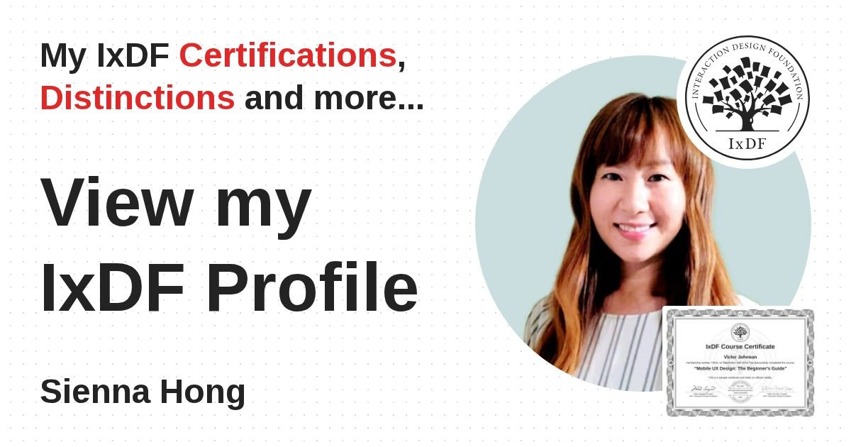IxDF Course Certificates are awarded to Sienna Hong in formal recognition of their coursework surpassing the rigorous benchmarks of exceptional performance established by the IxDF Educational Codex.