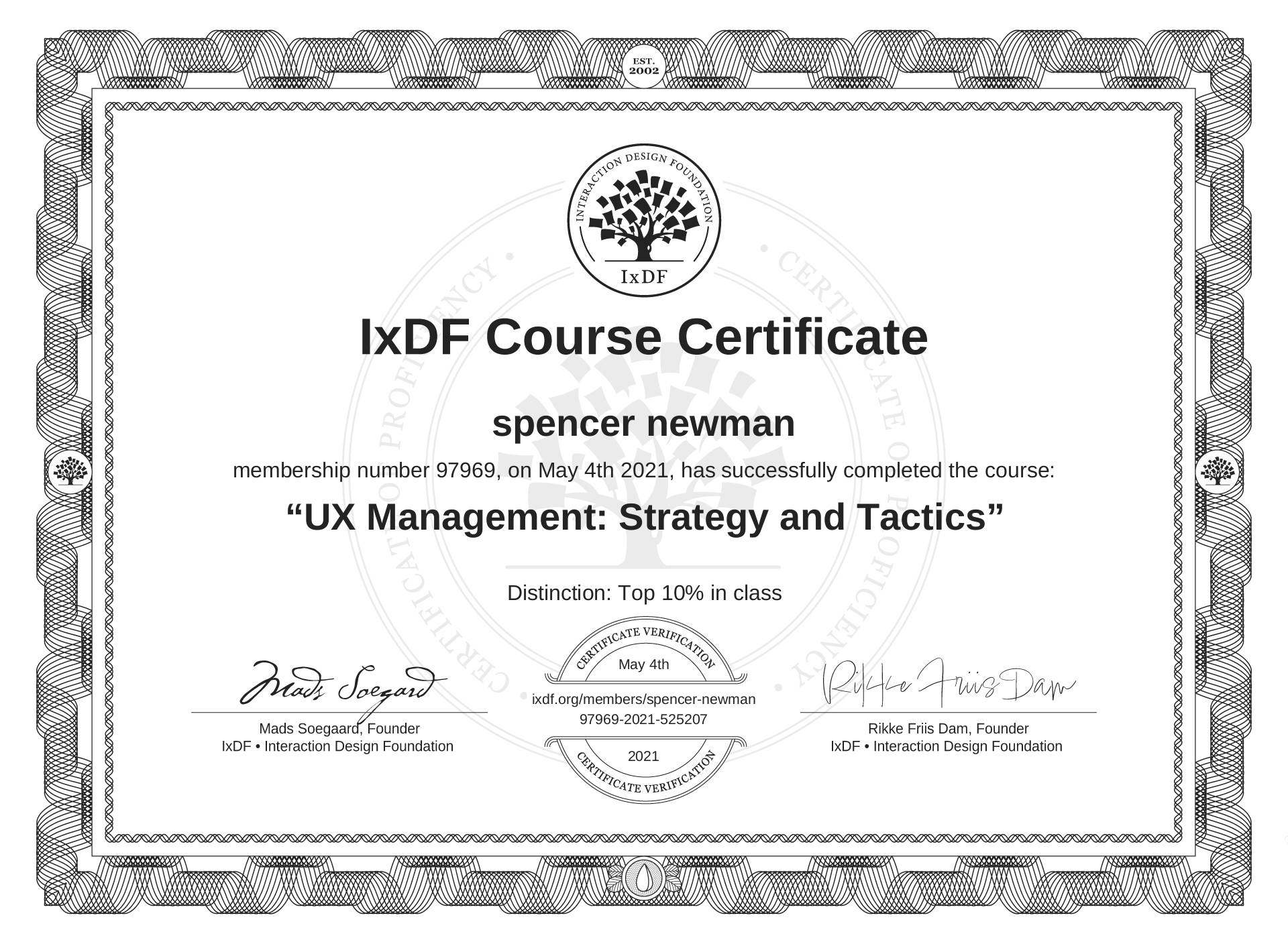 The IxDF Course Certificate (ID #5c60d3b0-42e5-46ef-8686-d8c09c3654e7) above is awarded to spencer newman