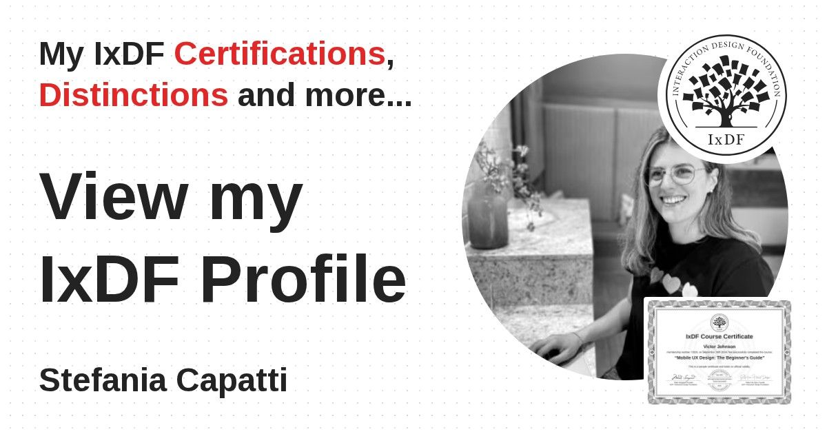 IxDF Course Certificates are awarded to Stefania Capatti in formal recognition of their coursework surpassing the rigorous benchmarks of exceptional performance established by the IxDF Educational Codex.