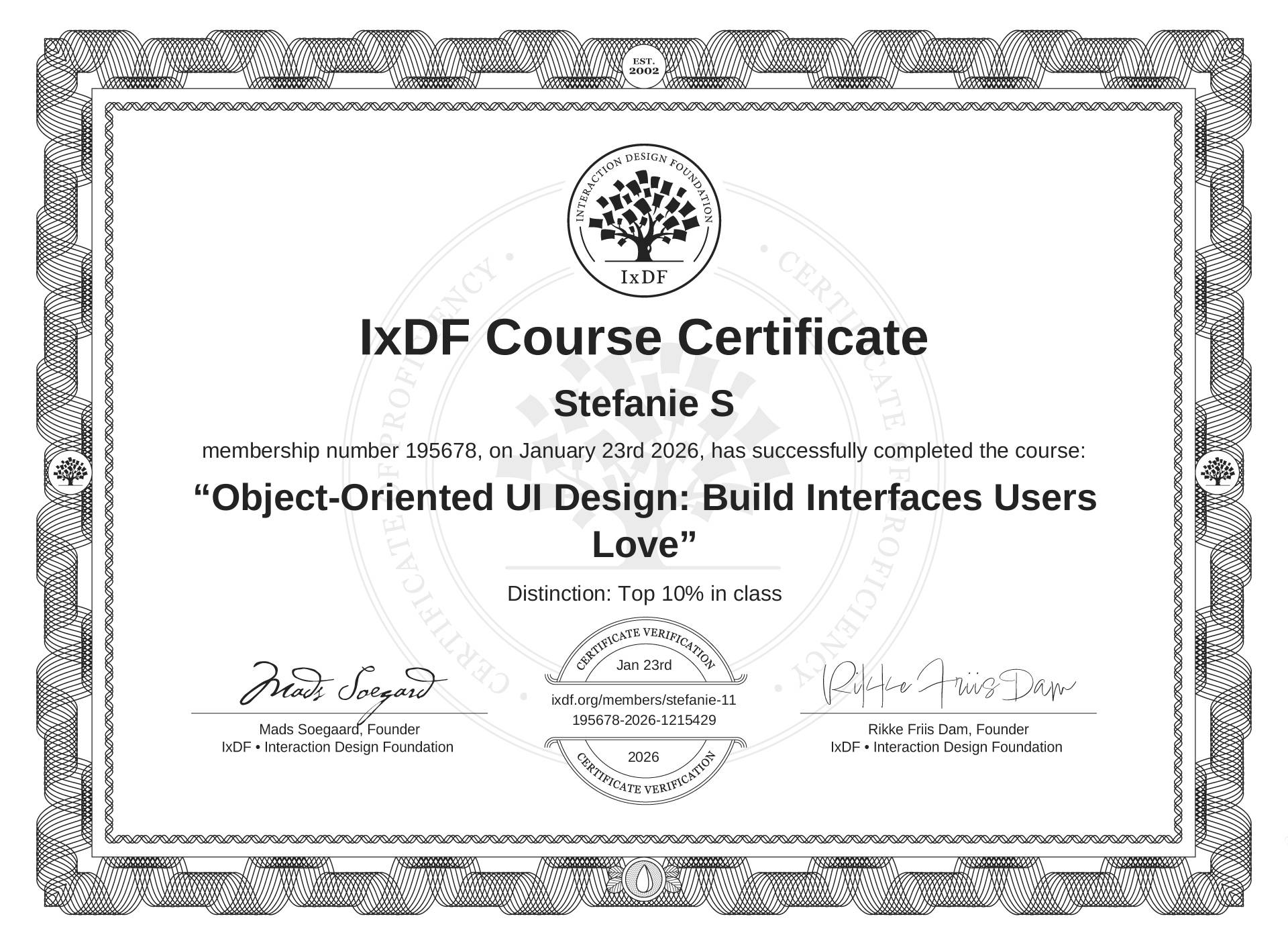 The IxDF Course Certificate (ID #47593609-ade0-47c4-9143-3c57e386c443) above is awarded to Stefanie S