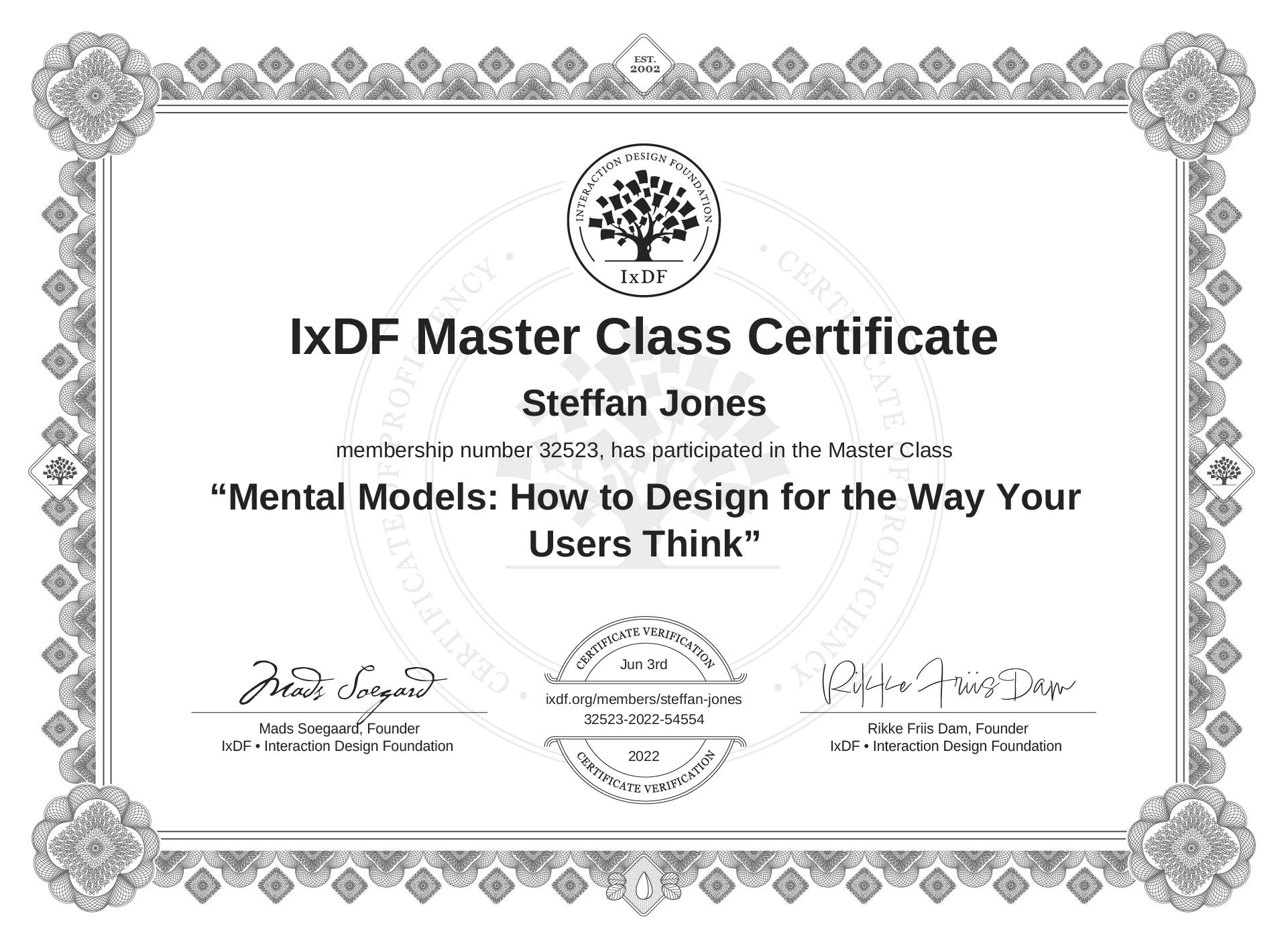 The IxDF Master Class Certificate (ID #mcc_da24428df4094ddb884a725dfcef05f6) above is awarded to Steffan Jones in formal recognition of their participation in the Master Class Mental Models: How to Design for the Way Your Users Think .