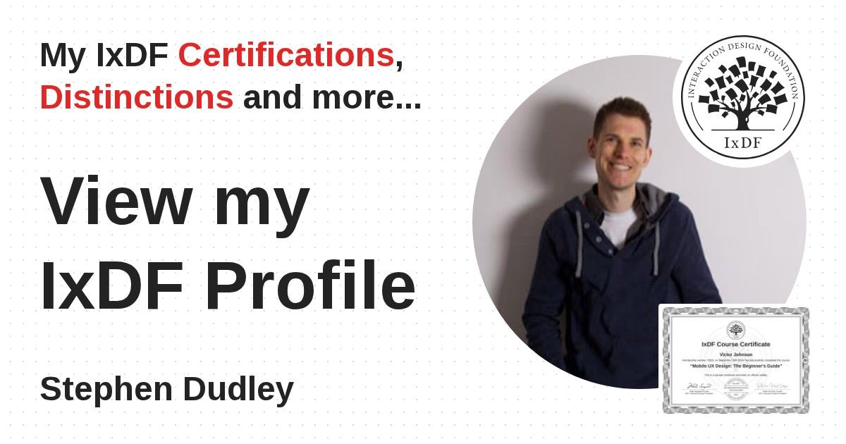 IxDF Course Certificates are awarded to Stephen Dudley in formal recognition of their coursework surpassing the rigorous benchmarks of exceptional performance established by the IxDF Educational Codex.