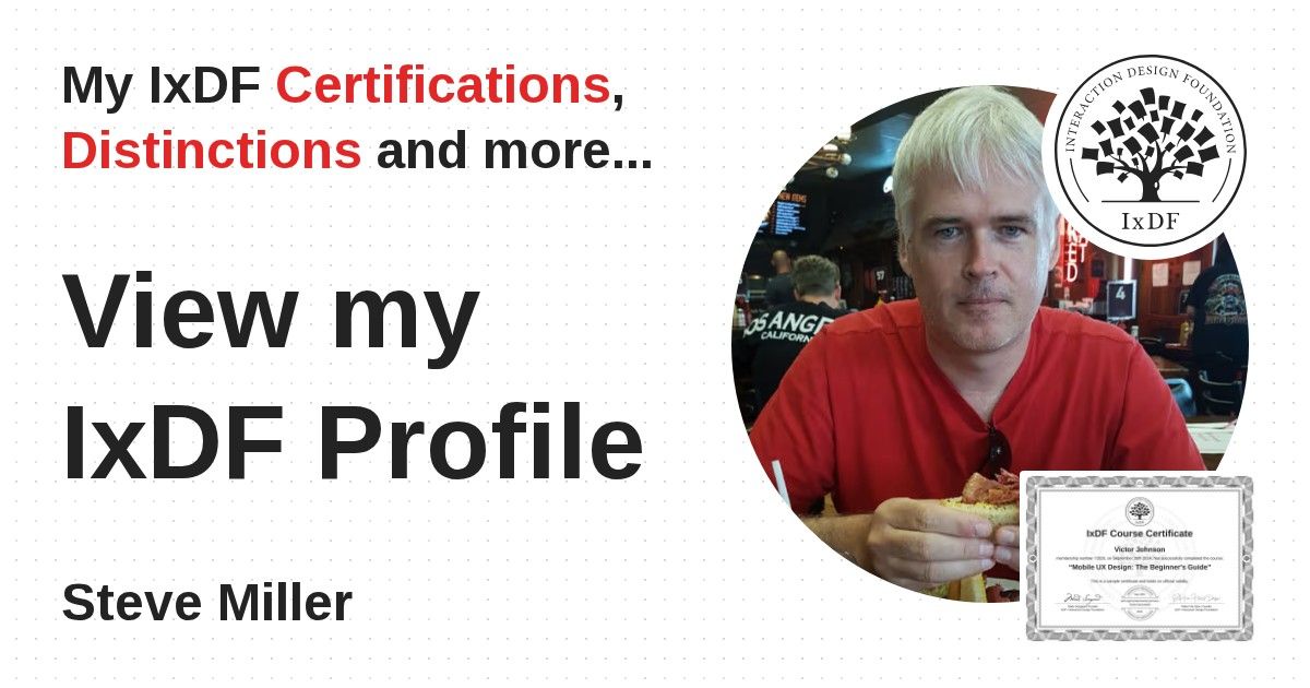 IxDF Course Certificates are awarded to Steve Miller in formal recognition of their coursework surpassing the rigorous benchmarks of exceptional performance established by the IxDF Educational Codex.