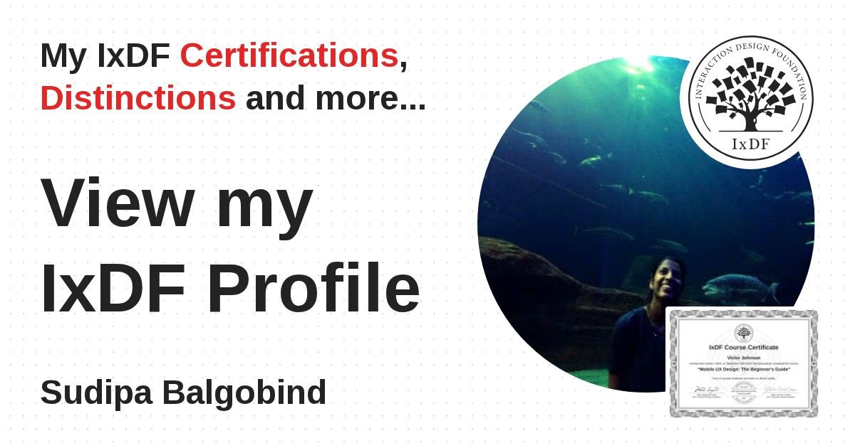 IxDF Course Certificates are awarded to Sudipa Balgobind in formal recognition of their coursework surpassing the rigorous benchmarks of exceptional performance established by the IxDF Educational Codex.