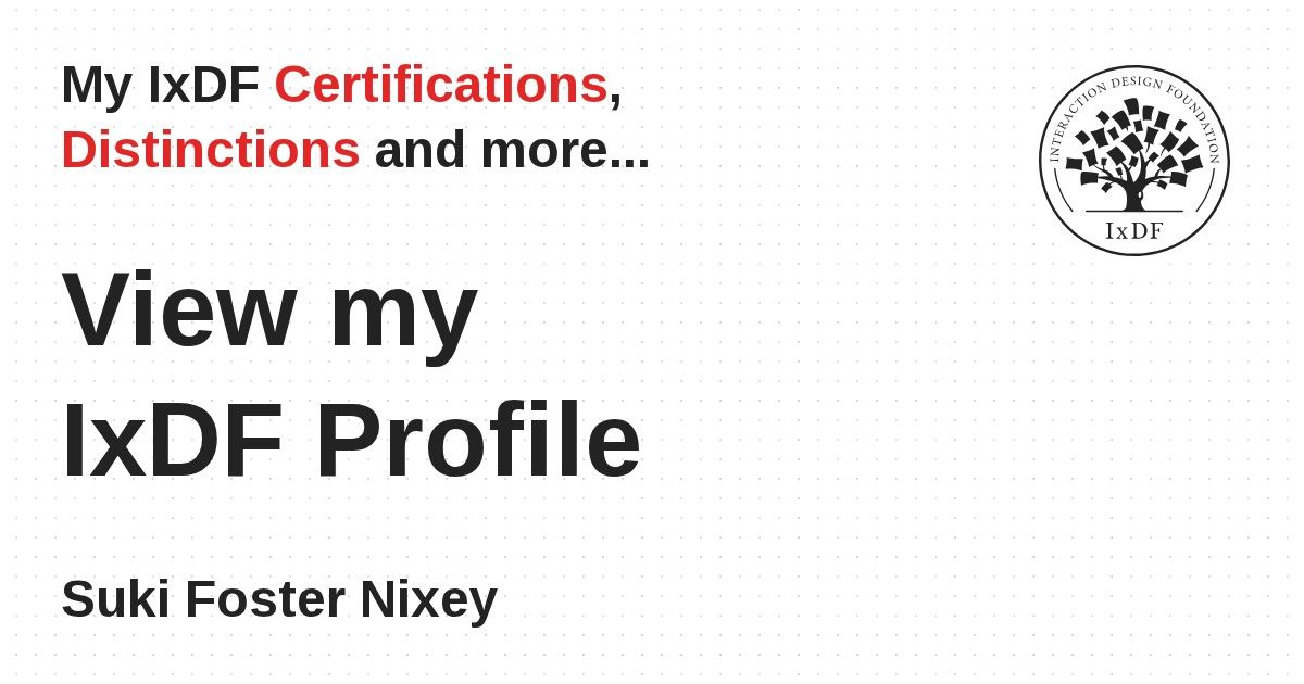 Distinctions are conferred upon Suki Foster Nixey in formal recognition of their notable achievements and contributions, as stipulated by the IxDF Educational Codex.