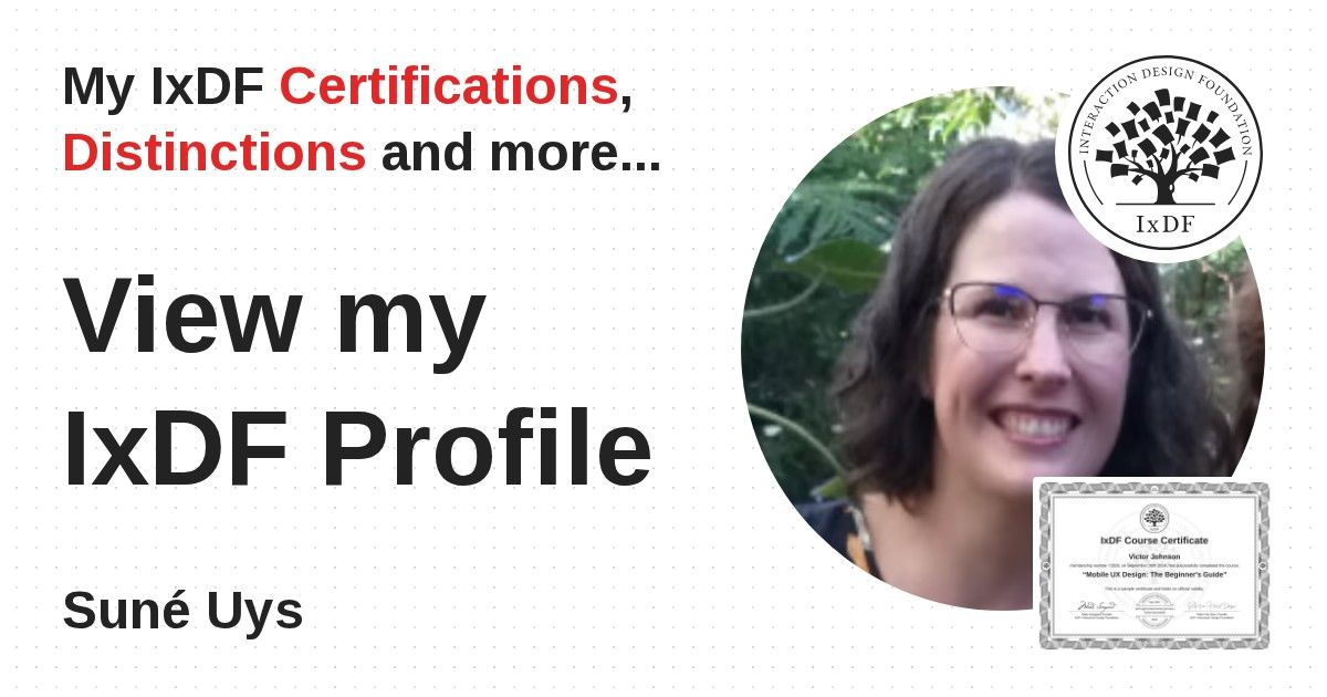 IxDF Course Certificates are awarded to Suné Uys in formal recognition of their coursework surpassing the rigorous benchmarks of exceptional performance established by the IxDF Educational Codex.
