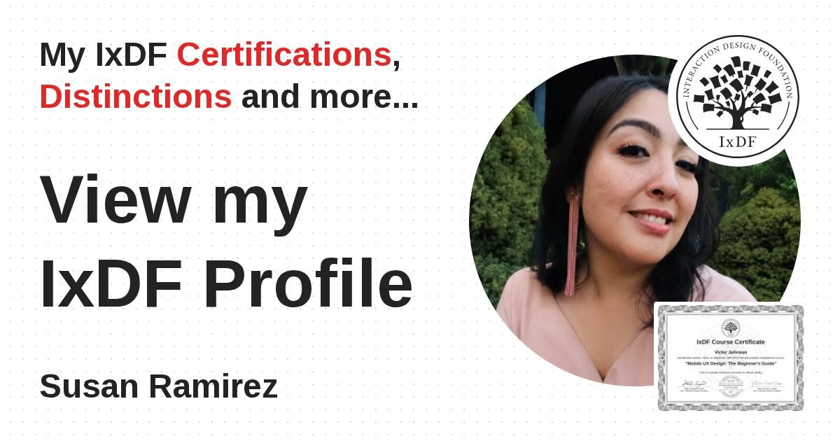 IxDF Course Certificates are awarded to Susan Ramirez in formal recognition of their coursework surpassing the rigorous benchmarks of exceptional performance established by the IxDF Educational Codex.