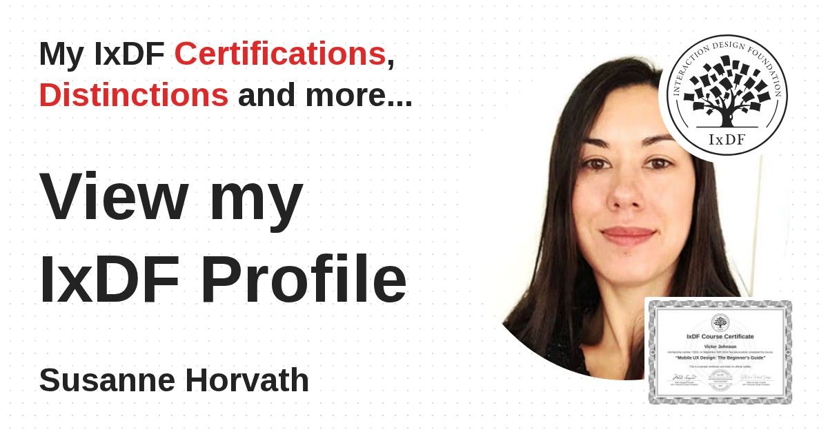 IxDF Course Certificates are awarded to Susanne Horvath in formal recognition of their coursework surpassing the rigorous benchmarks of exceptional performance established by the IxDF Educational Codex.