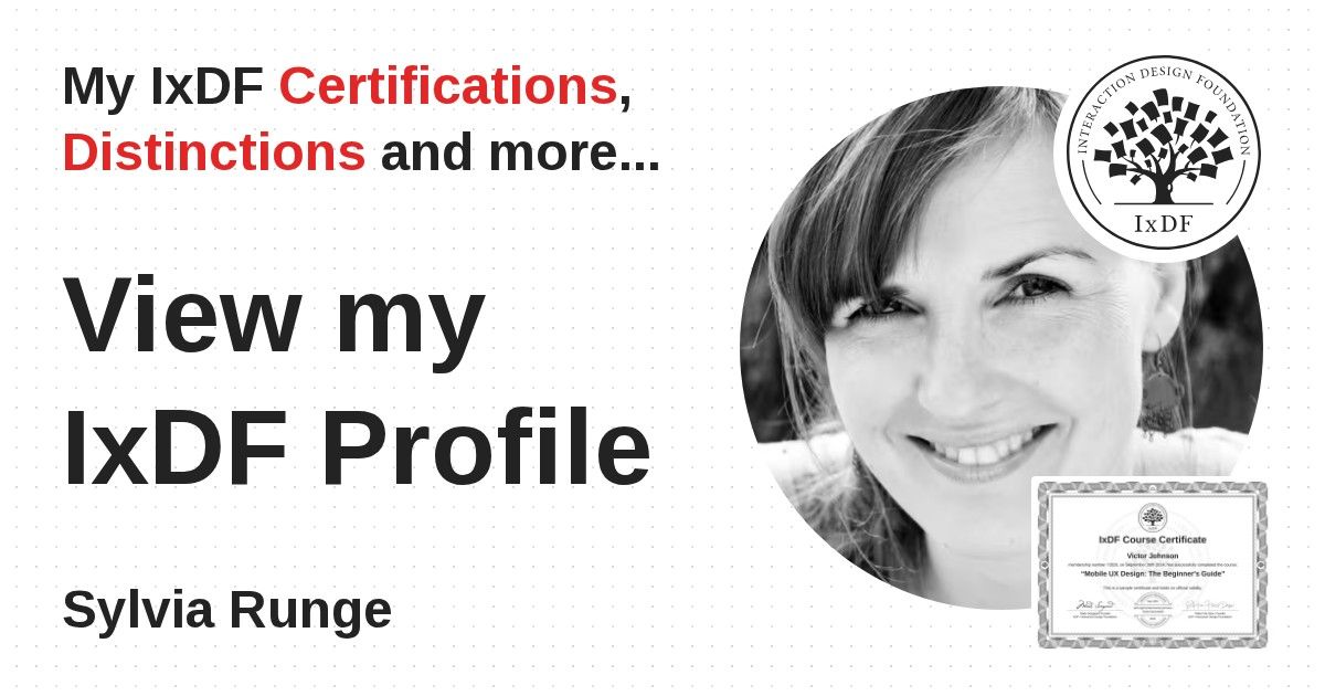 IxDF Course Certificates are awarded to Sylvia Runge in formal recognition of their coursework surpassing the rigorous benchmarks of exceptional performance established by the IxDF Educational Codex.