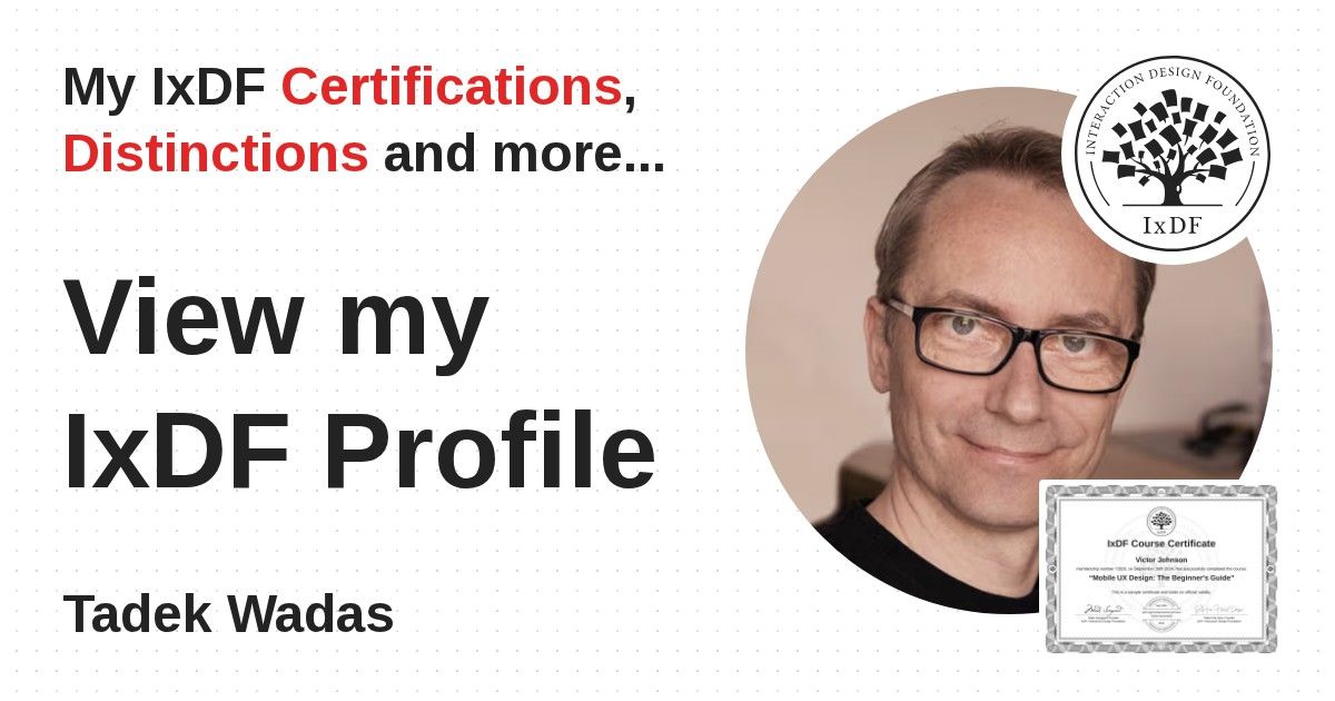 IxDF Course Certificates are awarded to Tadek Wadas in formal recognition of their coursework surpassing the rigorous benchmarks of exceptional performance established by the IxDF Educational Codex.