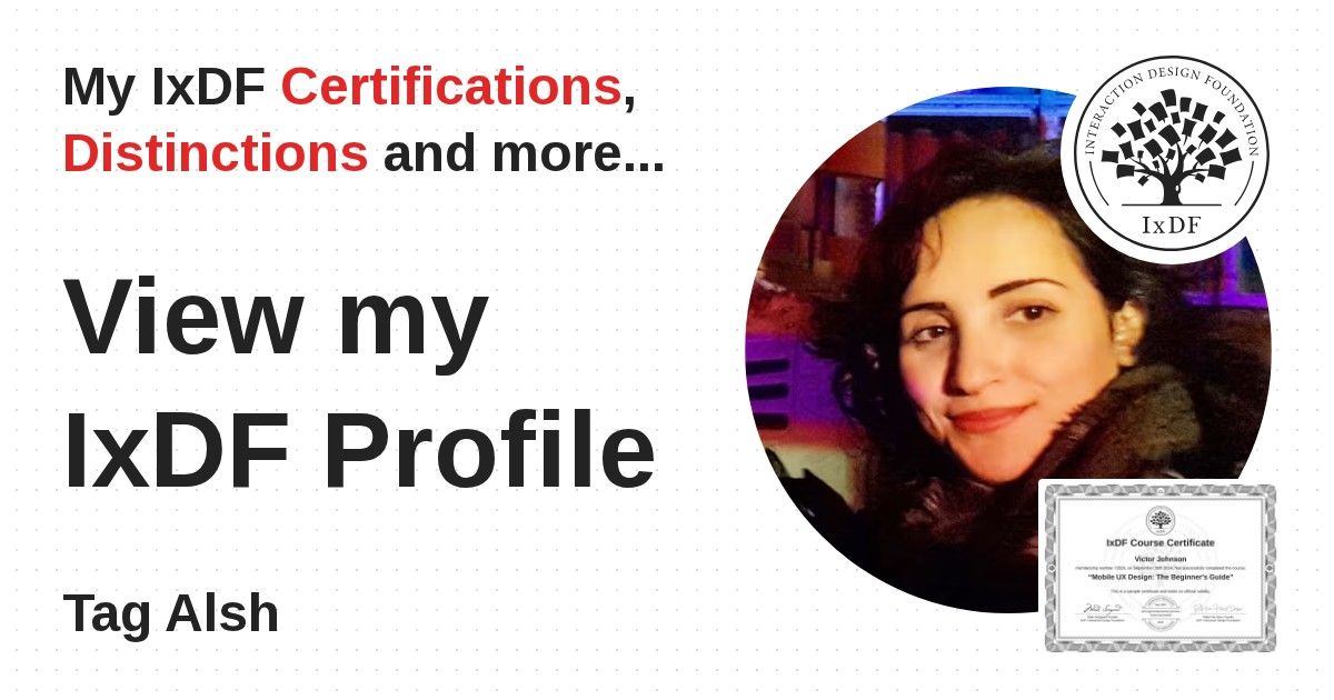 IxDF Course Certificates are awarded to Tag Alsh in formal recognition of their coursework surpassing the rigorous benchmarks of exceptional performance established by the IxDF Educational Codex.