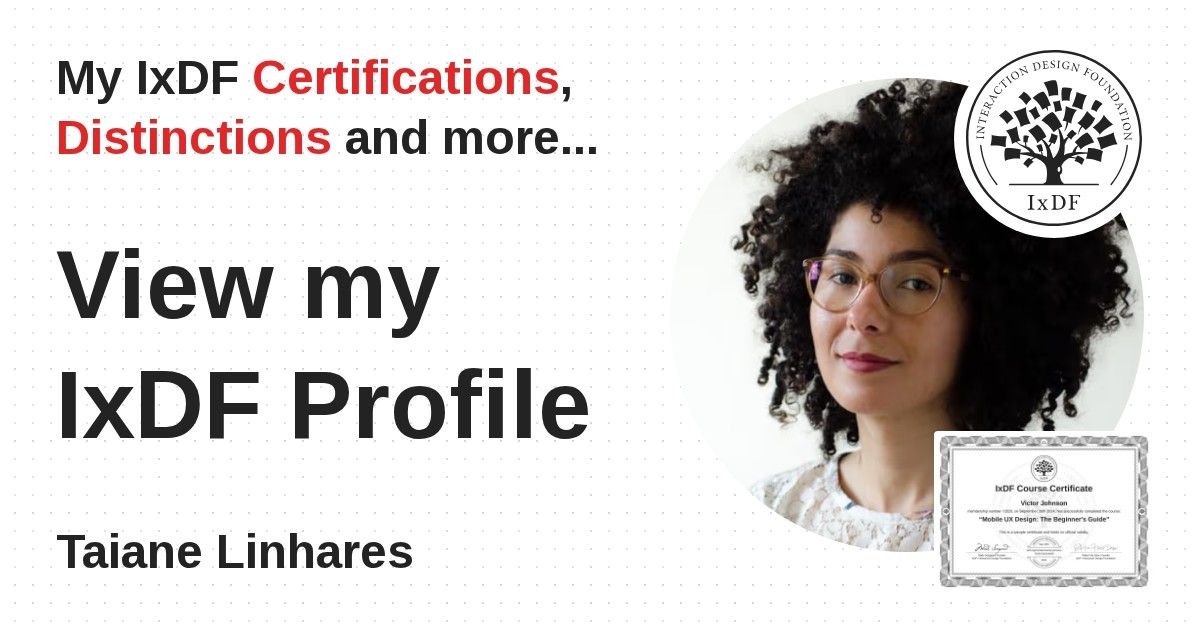 IxDF Course Certificates are awarded to Taiane Linhares in formal recognition of their coursework surpassing the rigorous benchmarks of exceptional performance established by the IxDF Educational Codex.