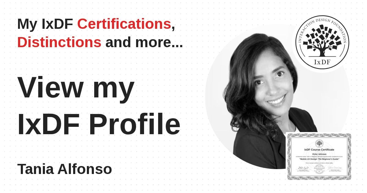 IxDF Course Certificates are awarded to Tania Alfonso in formal recognition of their coursework surpassing the rigorous benchmarks of exceptional performance established by the IxDF Educational Codex.