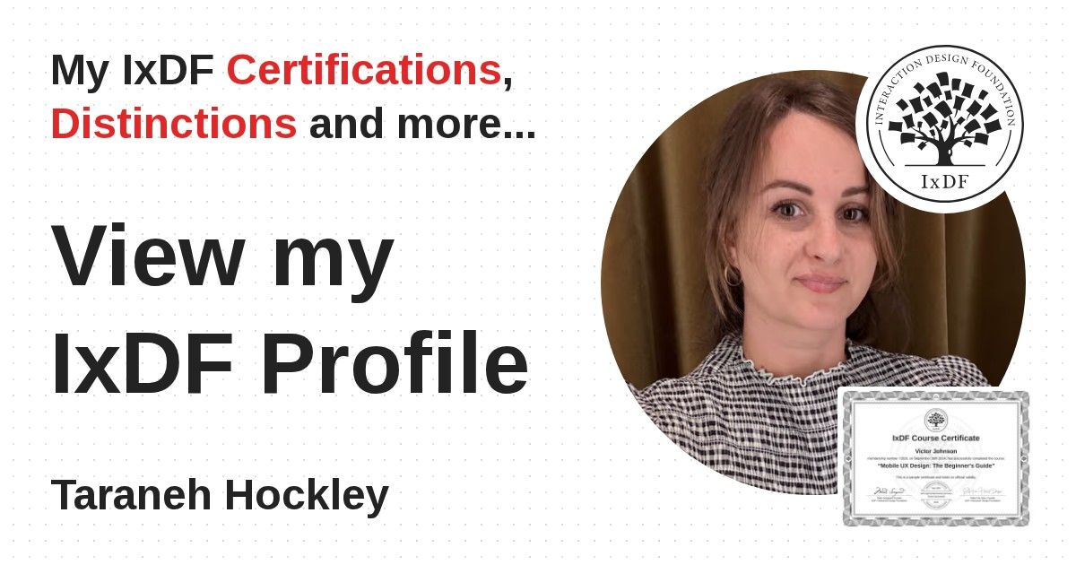 IxDF Course Certificates are awarded to Taraneh Hockley in formal recognition of their coursework surpassing the rigorous benchmarks of exceptional performance established by the IxDF Educational Codex.