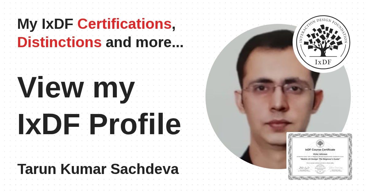 IxDF Course Certificates are awarded to Tarun Kumar Sachdeva in formal recognition of their coursework surpassing the rigorous benchmarks of exceptional performance established by the IxDF Educational Codex.
