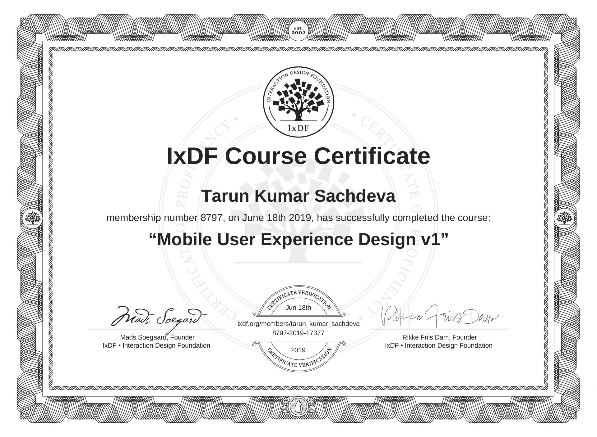 Tarun Kumar Sachdeva's Course Certificate: Mobile User Experience Design v1