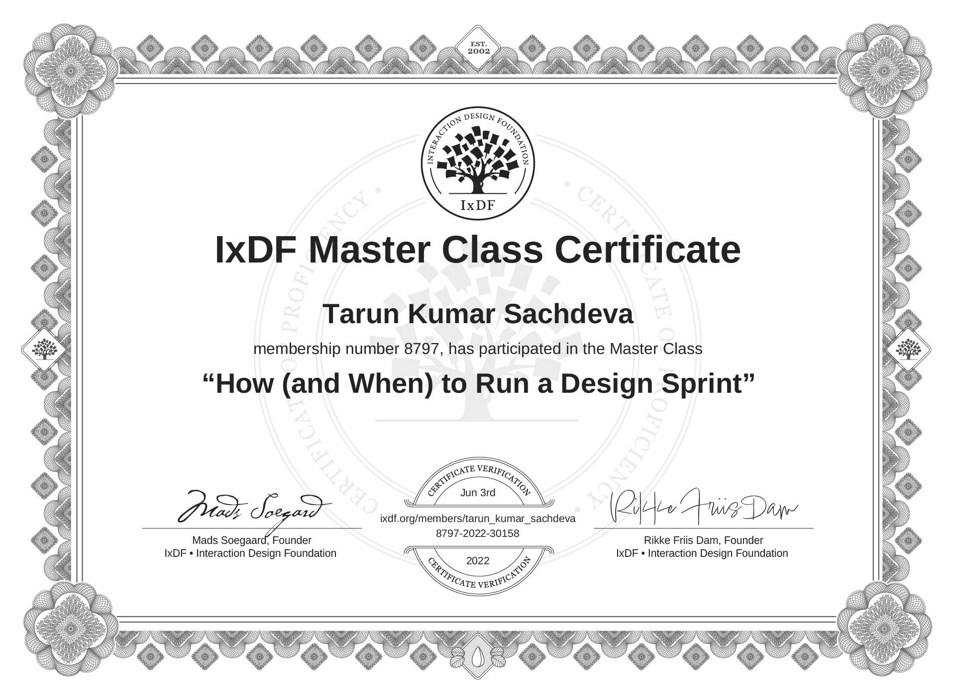 This IxDF Membership Certificate is issued to Tarun Kumar Sachdeva in formal recognition of their membership of the IxDF, global leader in design education.