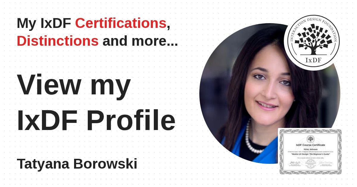 IxDF Course Certificates are awarded to Tatyana Borowski in formal recognition of their coursework surpassing the rigorous benchmarks of exceptional performance established by the IxDF Educational Codex.