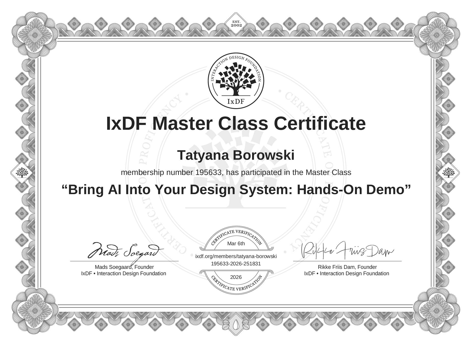 The IxDF Master Class Certificate (ID #mcc_f2178fb6fe394f82a8383752b7c6f0d9) above is awarded to Tatyana Borowski