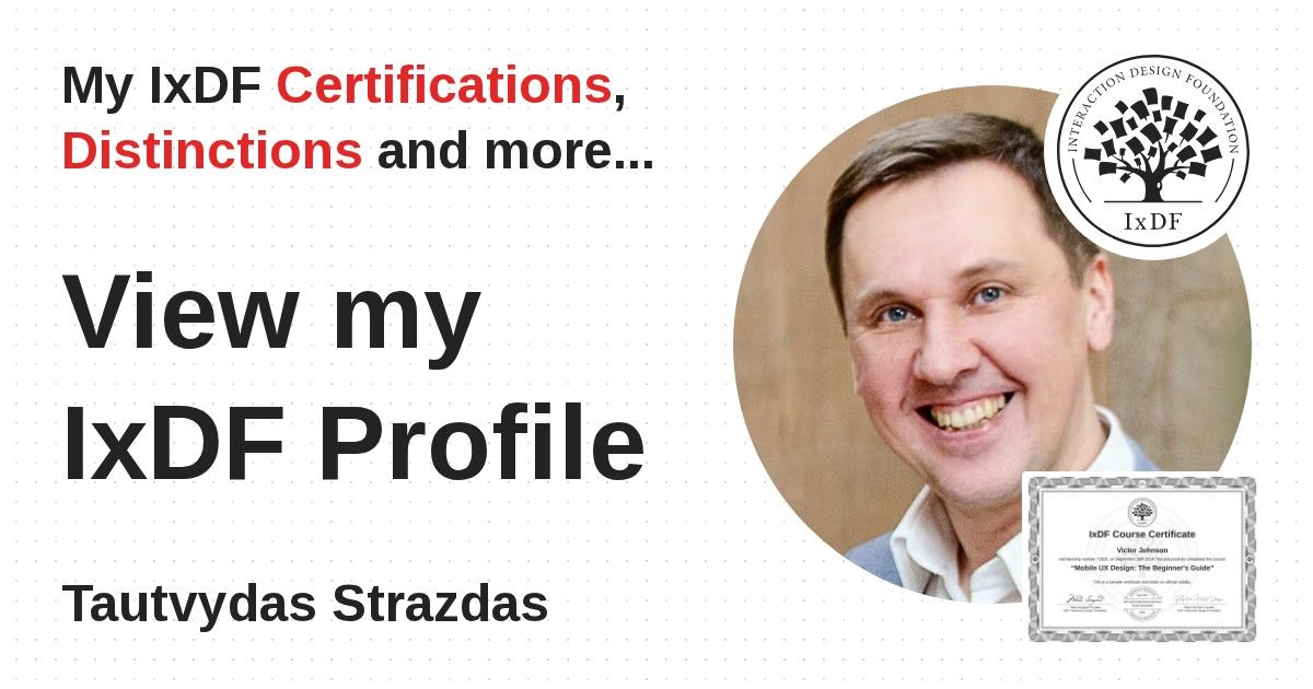 IxDF Course Certificates are awarded to Tautvydas Strazdas in formal recognition of their coursework surpassing the rigorous benchmarks of exceptional performance established by the IxDF Educational Codex.