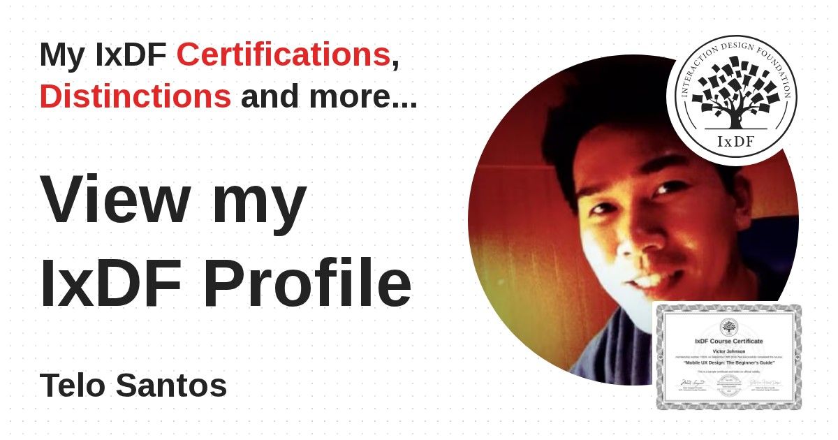 IxDF Course Certificates are awarded to Telo Santos in formal recognition of their coursework surpassing the rigorous benchmarks of exceptional performance established by the IxDF Educational Codex.
