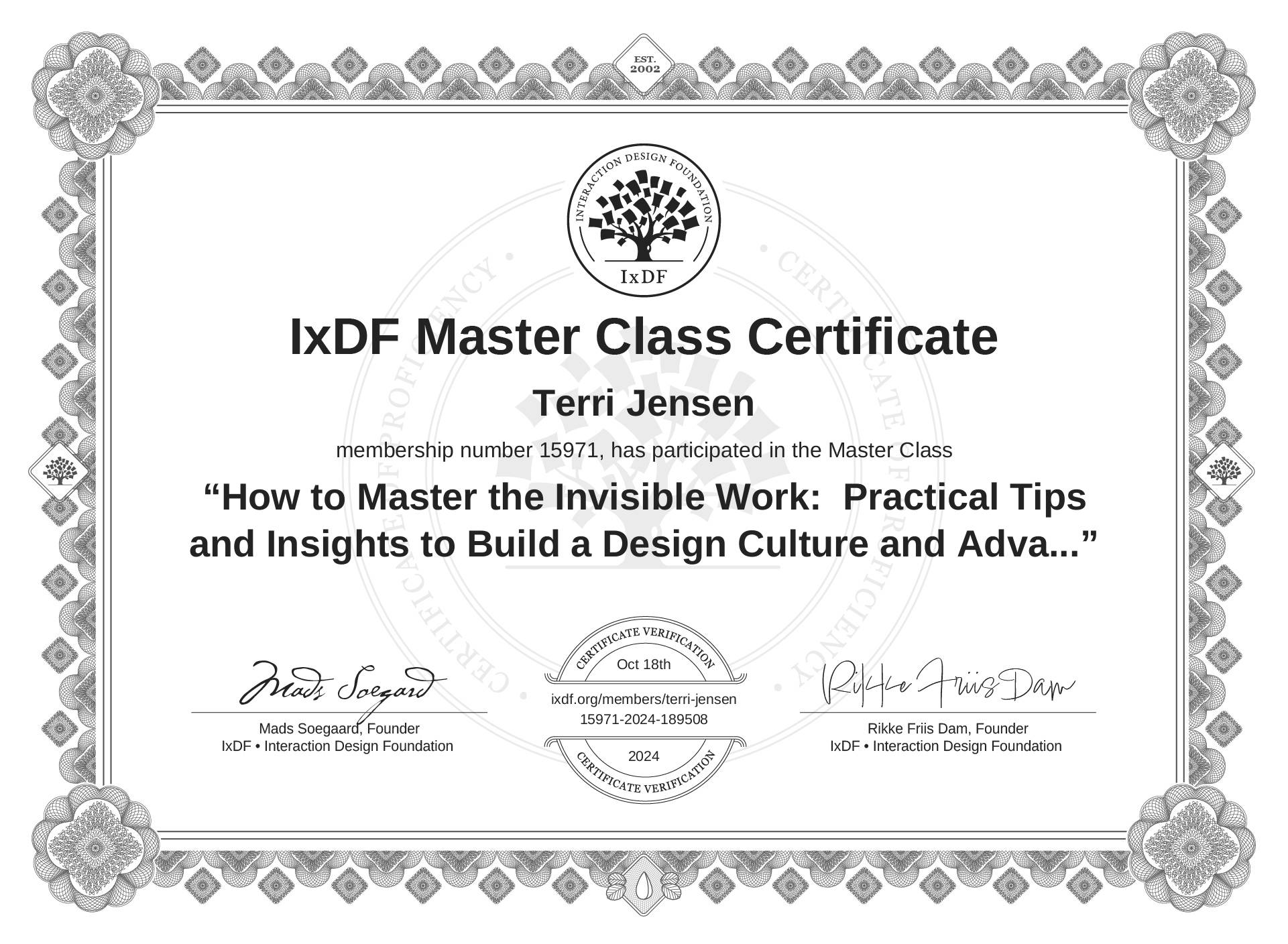IxDF Master Class Certificates are awarded to Terri Jensen in formal recognition of their attendance and ongoing commitment to learning from industry leaders.