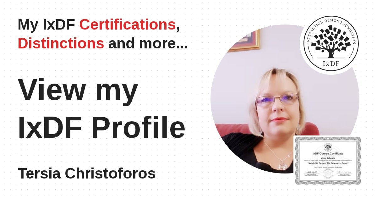IxDF Course Certificates are awarded to Tersia Christoforos in formal recognition of their coursework surpassing the rigorous benchmarks of exceptional performance established by the IxDF Educational Codex.