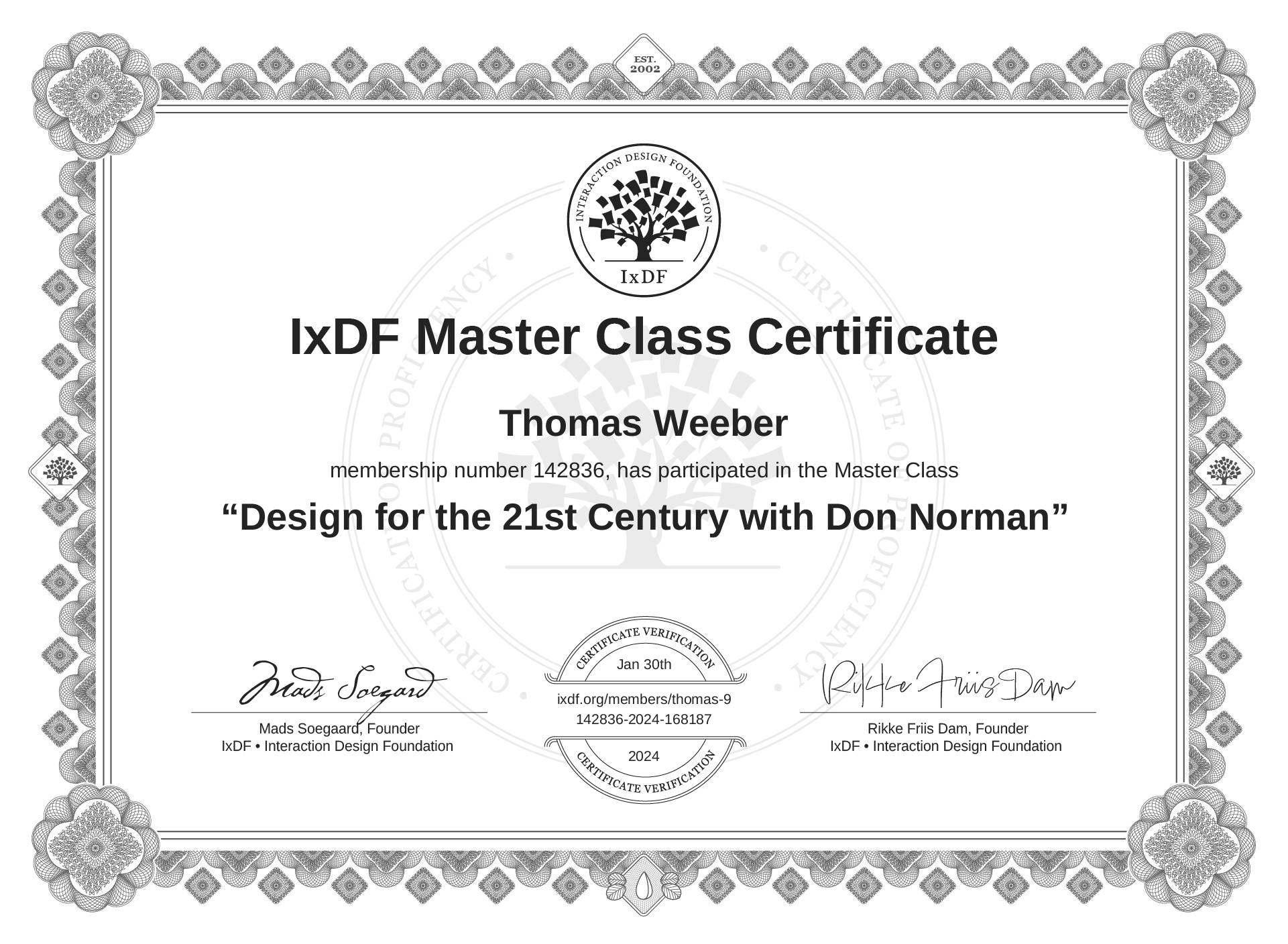 The IxDF Master Class Certificate (ID #mcc_16f0ad0d1e82462fbc5f22d126a4beb8) above is awarded to Thomas Weeber in formal recognition of their participation in the Master Class Design for the 21st Century with Don Norman .