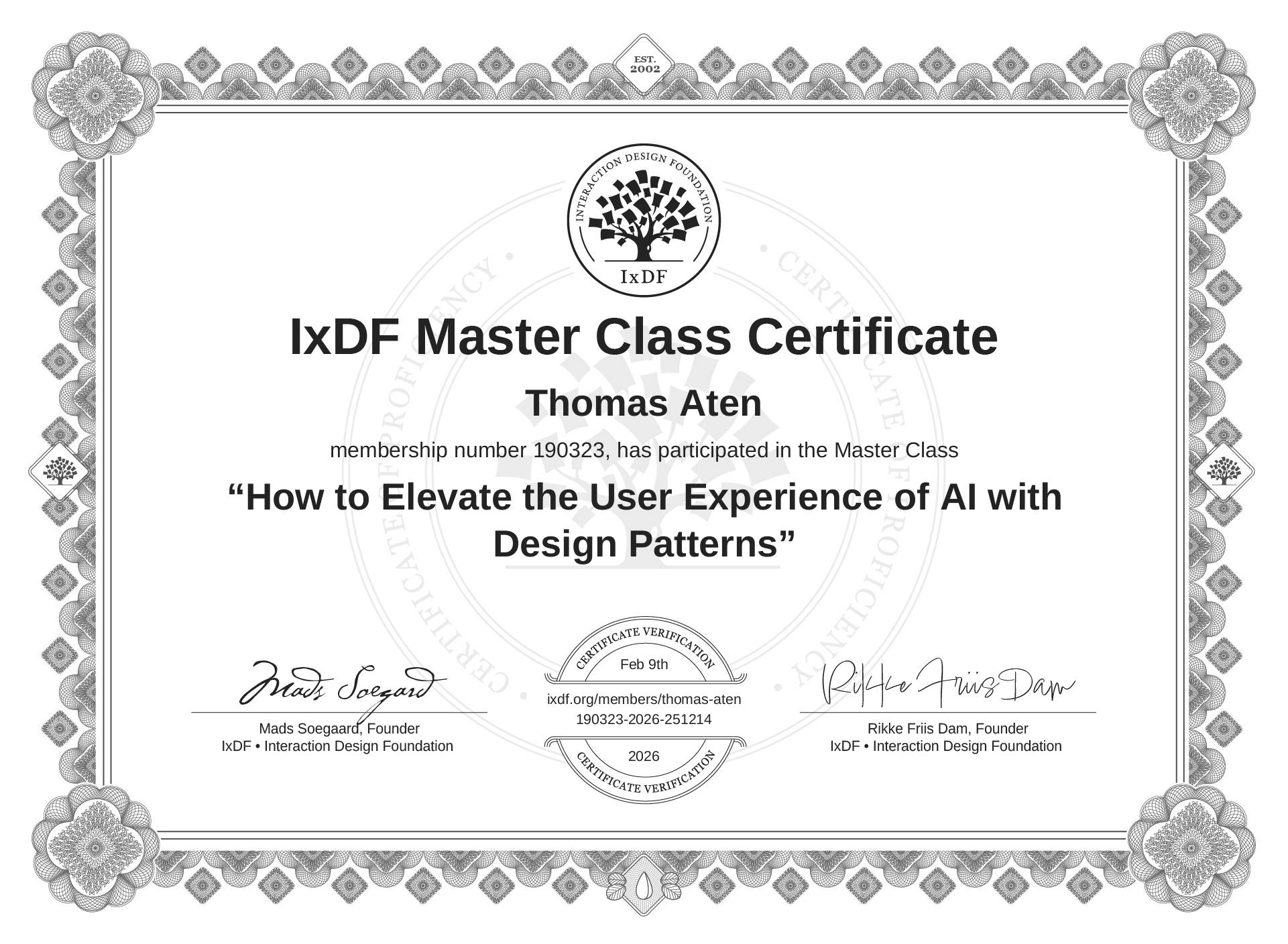 IxDF Master Class Certificates are awarded to Thomas Aten in formal recognition of their attendance and ongoing commitment to learning from industry leaders.