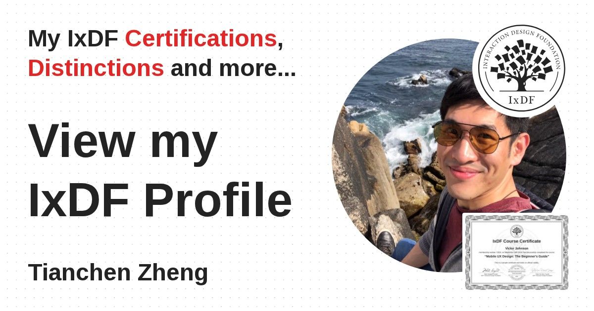 IxDF Course Certificates are awarded to Tianchen Zheng in formal recognition of their coursework surpassing the rigorous benchmarks of exceptional performance established by the IxDF Educational Codex.