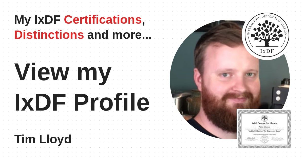 IxDF Course Certificates are awarded to Tim Lloyd in formal recognition of their coursework surpassing the rigorous benchmarks of exceptional performance established by the IxDF Educational Codex.