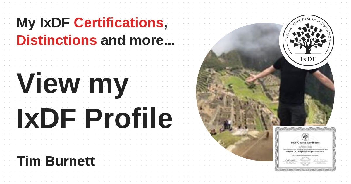 IxDF Course Certificates are awarded to Tim Burnett in formal recognition of their coursework surpassing the rigorous benchmarks of exceptional performance established by the IxDF Educational Codex.