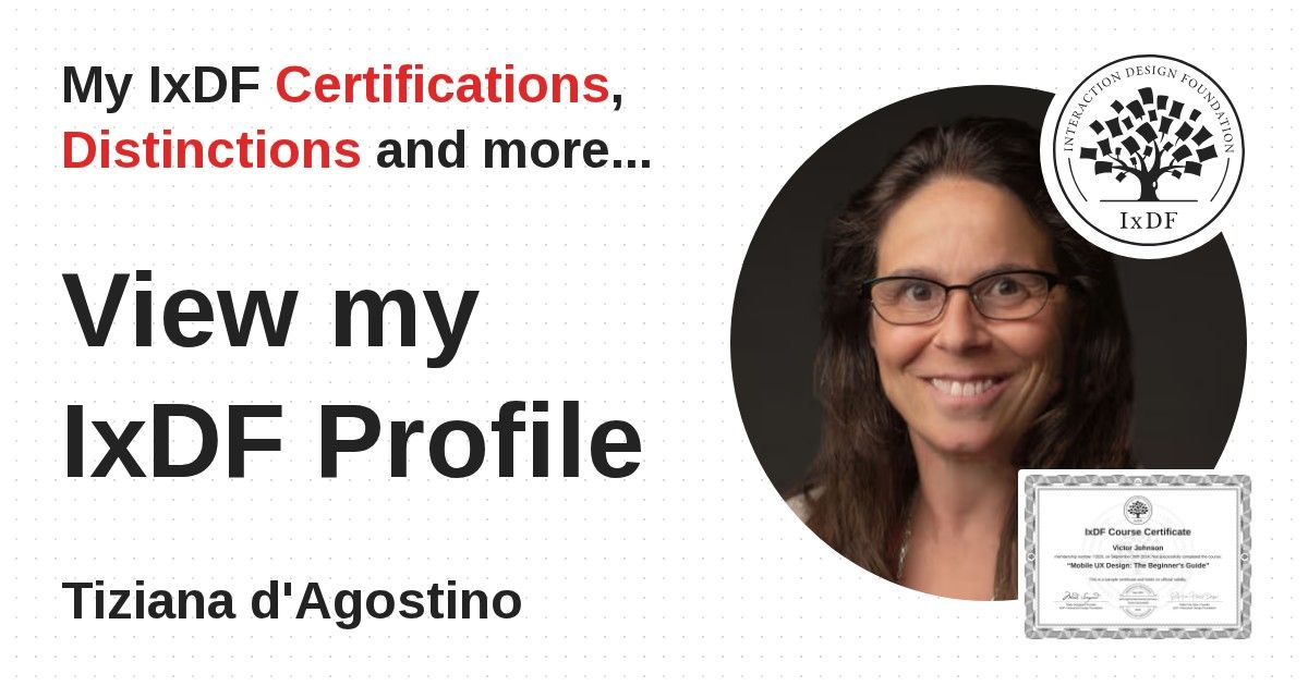 IxDF Course Certificates are awarded to Tiziana d'Agostino in formal recognition of their coursework surpassing the rigorous benchmarks of exceptional performance established by the IxDF Educational Codex.