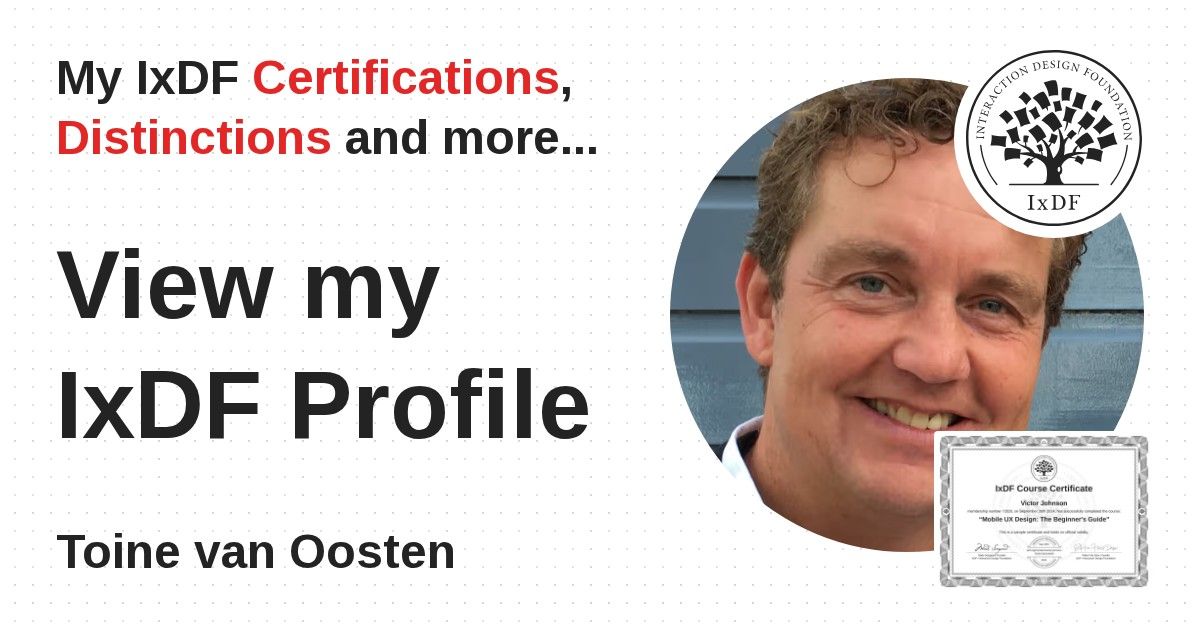 IxDF Course Certificates are awarded to Toine van Oosten in formal recognition of their coursework surpassing the rigorous benchmarks of exceptional performance established by the IxDF Educational Codex.