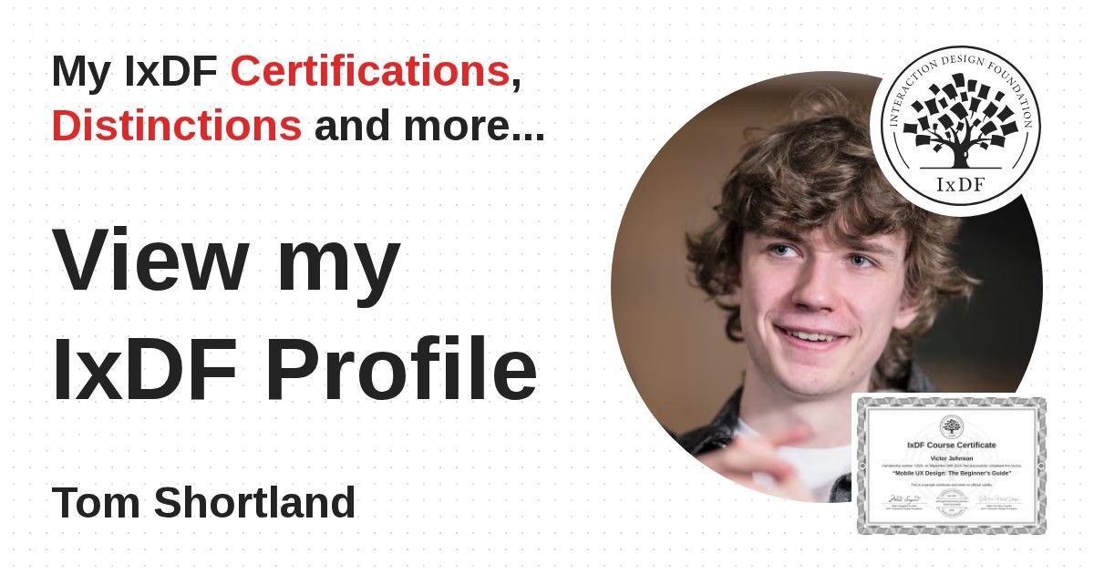 IxDF Course Certificates are awarded to Tom Shortland in formal recognition of their coursework surpassing the rigorous benchmarks of exceptional performance established by the IxDF Educational Codex.