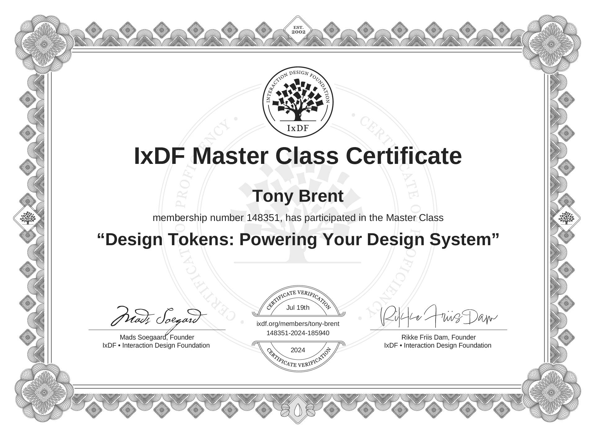 The IxDF Master Class Certificate (ID #mcc_d4e77d5fd8534389ae5721882743d135) above is awarded to Tony Brent in formal recognition of their participation in the Master Class Design Tokens: Powering Your Design System .