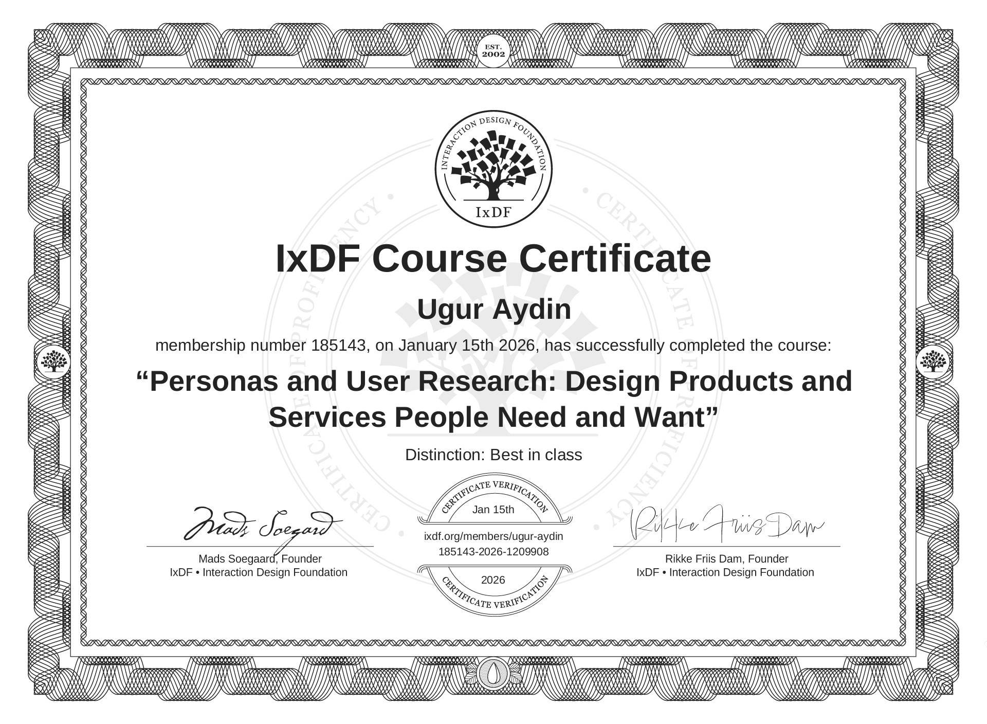 IxDF Course Certificates are awarded to Ugur Aydin in formal recognition of their coursework surpassing the rigorous benchmarks of exceptional performance established by the IxDF Educational Codex.