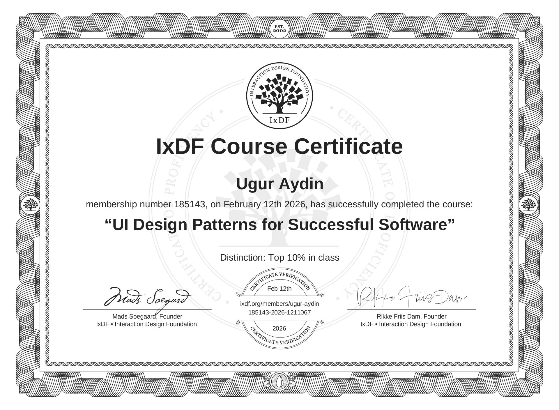 IxDF Course Certificates are awarded to Ugur Aydin in formal recognition of their coursework surpassing the rigorous benchmarks of exceptional performance established by the IxDF Educational Codex.