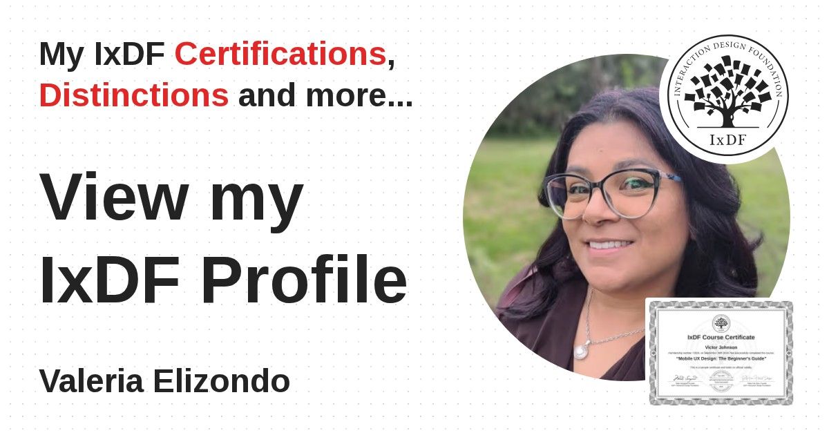 IxDF Course Certificates are awarded to Valeria Elizondo in formal recognition of their coursework surpassing the rigorous benchmarks of exceptional performance established by the IxDF Educational Codex.