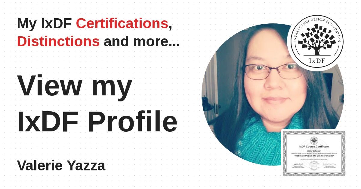 IxDF Course Certificates are awarded to Valerie Yazza in formal recognition of their coursework surpassing the rigorous benchmarks of exceptional performance established by the IxDF Educational Codex.