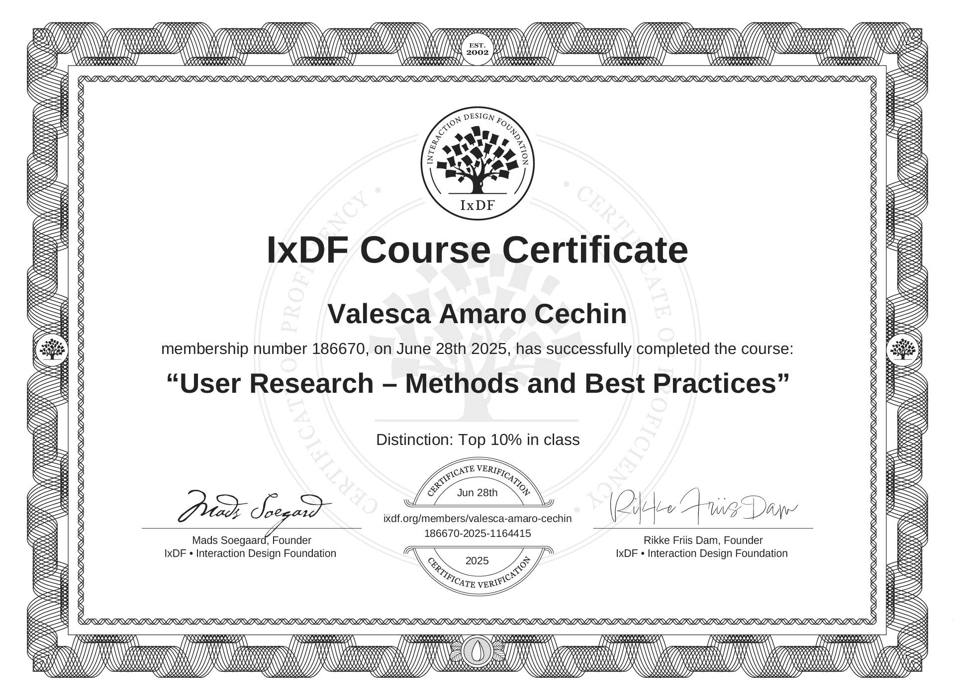 This IxDF Membership Certificate is issued to Valesca Amaro Cechin