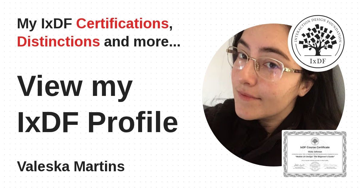 IxDF Course Certificates are awarded to Valeska Martins in formal recognition of their coursework surpassing the rigorous benchmarks of exceptional performance established by the IxDF Educational Codex.