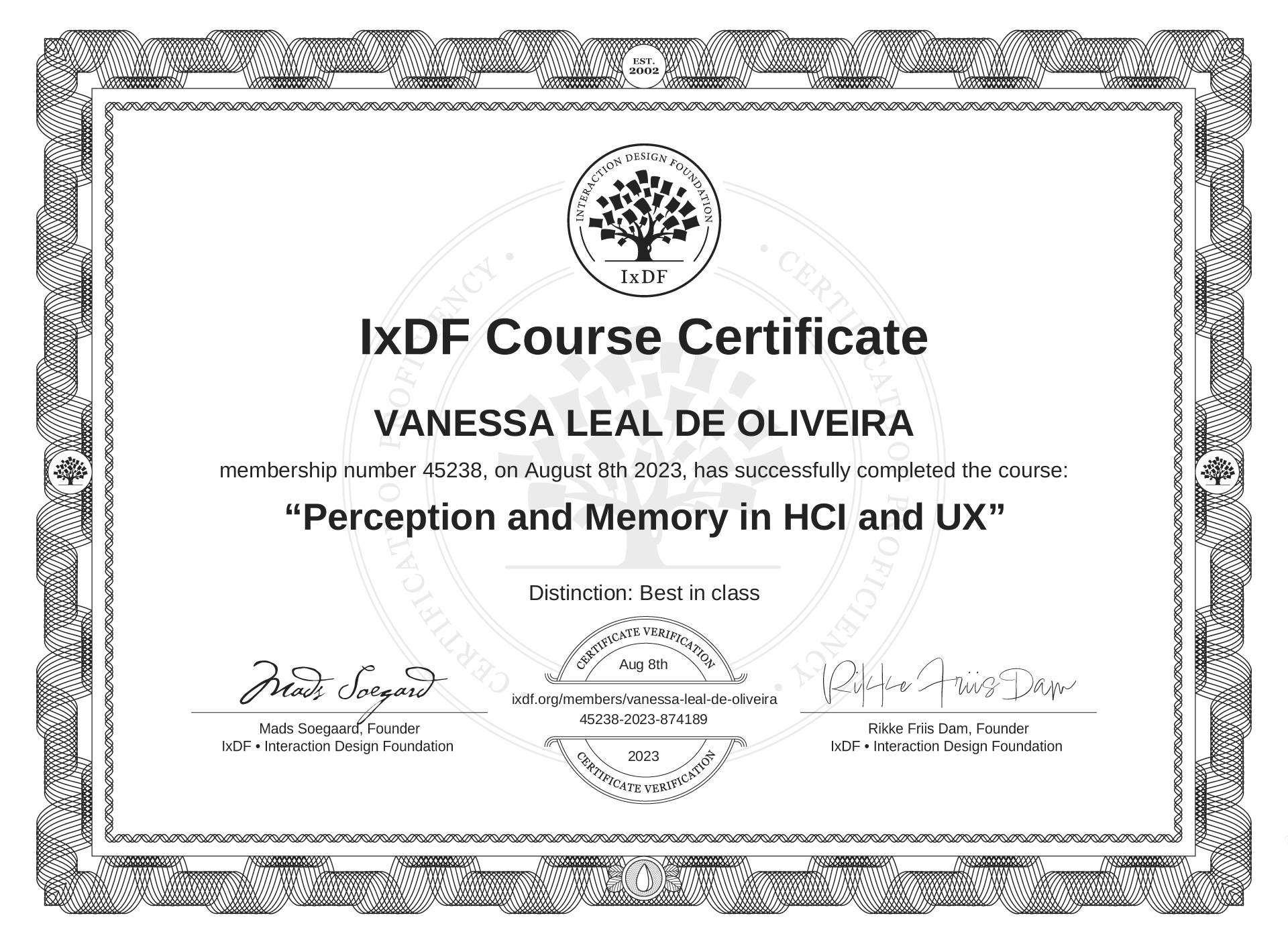 This IxDF Membership Certificate is issued to VANESSA LEAL DE OLIVEIRA