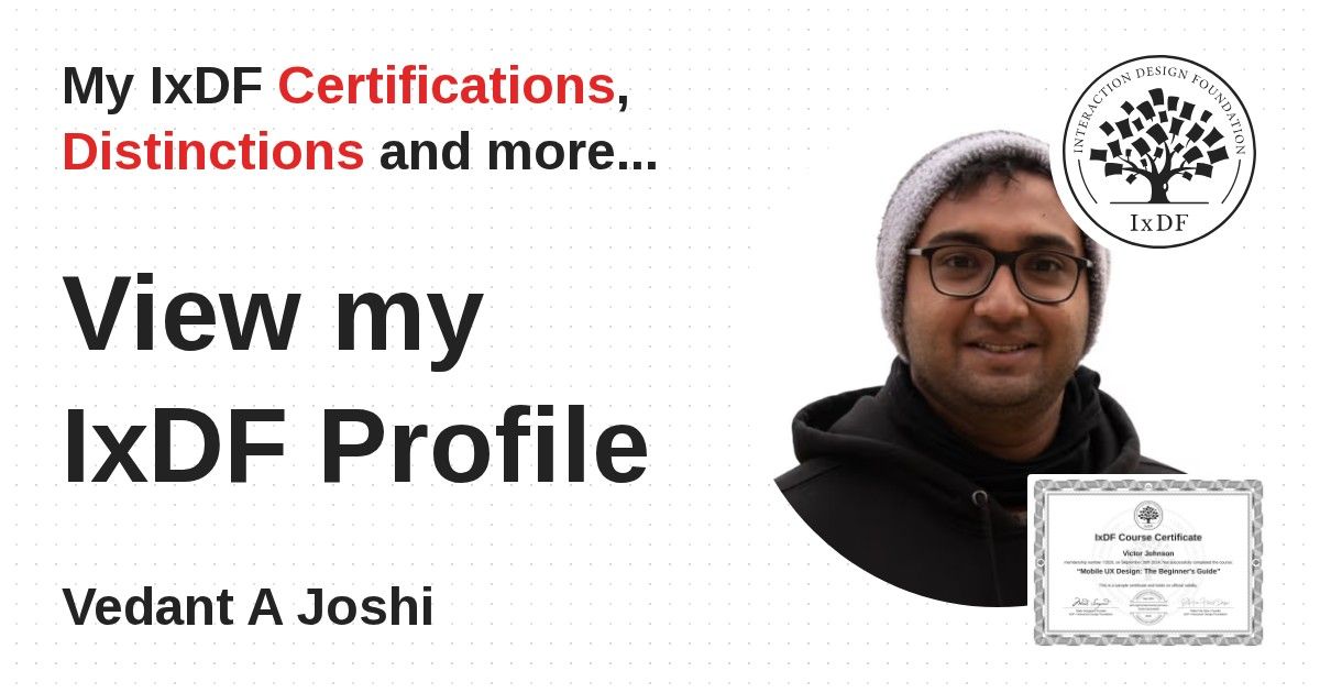 IxDF Course Certificates are awarded to Vedant A Joshi in formal recognition of their coursework surpassing the rigorous benchmarks of exceptional performance established by the IxDF Educational Codex.